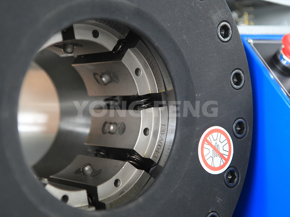 3. 按下張開按鈕,模座張開后,根據所扣壓膠管規格選用相應的模具安裝在模座上,并調整千分尺刻度。