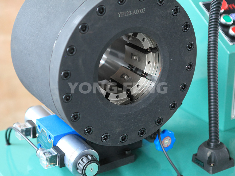 從液壓油管扣壓參數表中查得Ф19mm四層鋼絲膠管接頭外套外徑扣壓前為37mm,扣壓后為33.5mm,應選用的模具內徑為Ф33mm,對應千分尺刻度為3。安裝好Ф33mm模具于模座上,并將千分尺刻度旋至3處,將膠管剝皮后與接頭組裝好。扣壓完畢后測量接頭外套外徑就是扣壓參數表的扣壓后數值33.5mm,則完成扣壓。如扣壓后外徑不符,微調千分尺后扣壓下一根膠管。扣壓膠管接頭時:扣壓尺寸過多,膠管內膠層被壓斷,造成漏油;扣壓尺寸太少,造成漏油和被油壓沖脫接頭。務必掌握合理扣壓度,以接頭芯子內孔收縮度為準,國標接頭受壓縮小0.1~0.4mm,普通接頭受壓縮小0.1~2mm。因膠管及接頭外套的生產廠家不同,如北方大多數膠管生產廠用GB標準,南方用602標準,國外SAE標準,各廠膠管、接頭的具體尺寸、材質可能不盡相同,因此扣壓參數表數據僅供參考,具體扣壓尺寸應以壓力實驗為依據。